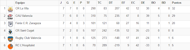 En el Grupo B tampoco fallaron los tres favoritos. La Vila venció holgadamente a Valencia RC manteniendo su primera plaza, CAU Valencia hizo lo propio en el Campo del Río frente a Sant Cugat y Rugby Fénix no perdió la estela en su visita a Hospitalet.